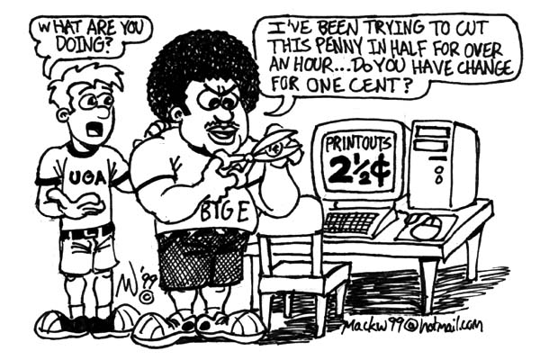 ![]() This cartoon is a revised version of the first one. I tried to make the joke more obvious, and instead of just putting Big E's name in the drawing, I actually drew him. He's the big guy with the afro (obviously). Unfortunately, when I submitted this to The Read & Black, they said that it looked racist, because they thought I was making fun of stereotypical black people and saying all blacks are stupid, or something like that. By the time I told them the real story, the cartoon was just too outdated. So Big E's cartoon never saw the light of publication, until now. Back to Unpublished Cartoons |