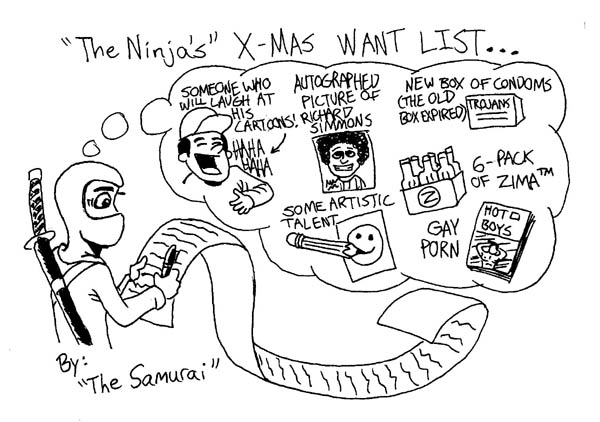 ![]() When "The Ninja" held the editorial cartoon spot in The Red & Black for three straight days with different "X-mas wish list" cartoons, I felt I had to do something. I think it will be plain to see why this cartoon was rejected by the good people at The Red & Black. So, yet another drawing ends up in cartoon purgatory. Back to Unpublished Cartoons |