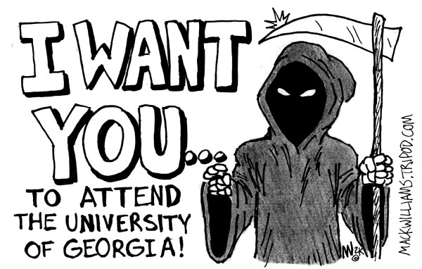 ![]() 8 people died at UGA in a month and suddenly it seemed like being a student here was hazerdous to your health. I did this cartoon, but The Red & Black wouldn't run it, and I can see why. It's pretty dark humor, and I wouldn't want anyone who had loved ones die think I was making light of their loss. Back to Unpublished Cartoons |