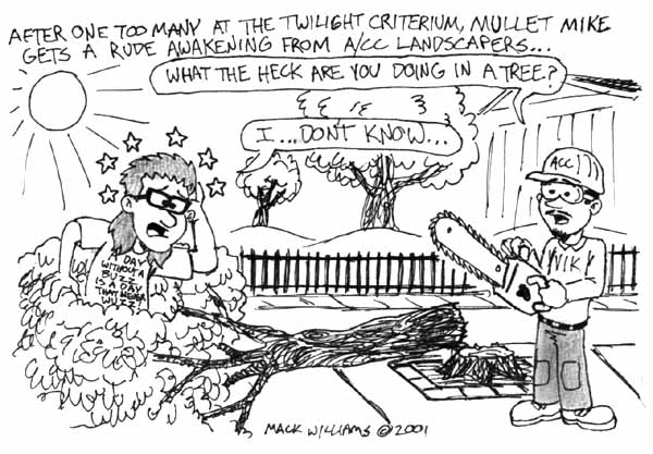 ![]() You konw the Bike race every year? That's the Twilight Criterium. ANd after this year's, they cut down all the trees downtown. And Mullet Mike likes to get drunk. So there you have it...This cartoon isn't really funny, in case you didn't notice. Back to Unpublished Cartoons |