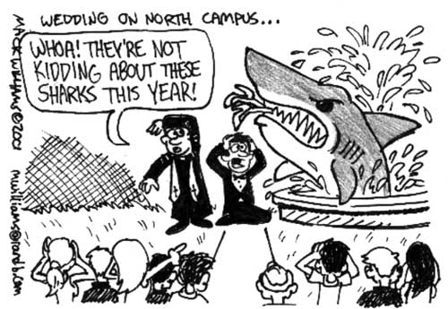 ![]() You may recognize this cartoon from the one that actually DID run in the paper that was just like it, with one big difference...This one has the shark eating the bride from the wedding on North Campus earlier this semester. Funny right? Nope, not according to my editors. Apparently, weddings are sacred moments between two people who love each other very much or something. Whatever...The shark is coming out of the fountain! That's comedy magic! Back to Unpublished Cartoons |