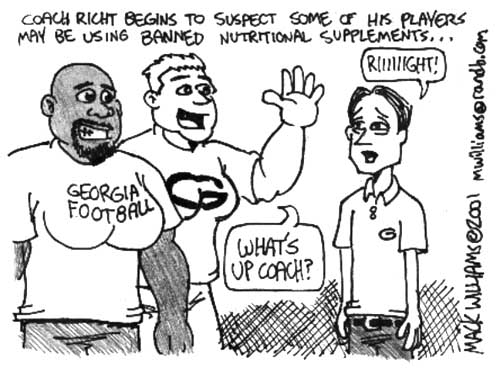 ![]() This cartoon is based on a story from The Red & Black about nutritional supplements that some atheletes take and stuff like that. The editors said this cartoon looked too much like we were "accusing" the football team of taking banned substances, but I disagreed. I just thought it was funny. But what do I know? Back to Unpublished Cartoons |